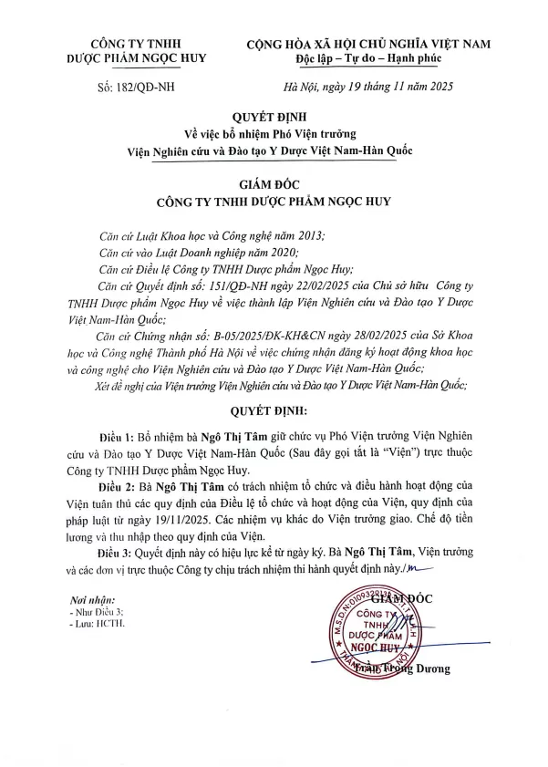Ngày 19/11/2025, Giám đốc Công ty TNHH Dược phẩm Ngọc Huy đã ký Quyết định số 182/QĐ-NH về việc bổ nhiệm chức danh Phó Viện trưởng Viện Nghiên cứu và Đào tạo Y Dược Việt Nam - Hàn Quốc đối với bà Ngô Thị Tâm