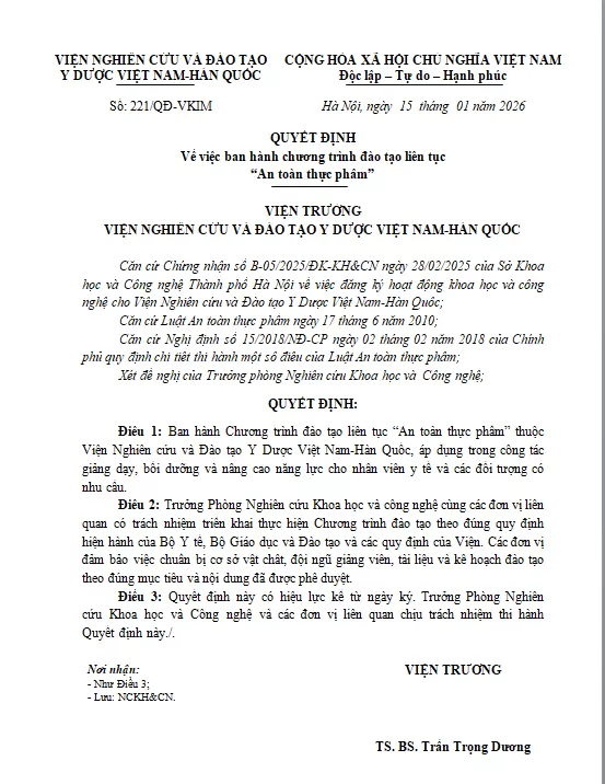 Ngày 15/01/2026, Viện trưởng Viện Nghiên cứu và Đào tạo Y Dược Việt Nam-Hàn Quốc đã ký và ban hành Quyết định số 221/QĐ-VKIM về việc ban hành chương trình đào tạo liên tục "An toàn thực phẩm".