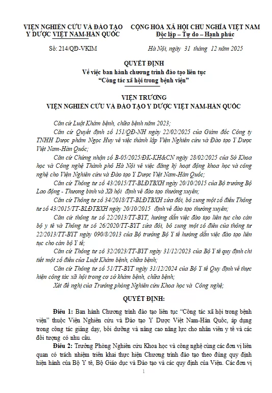 Ngày 31/12/2025, Viện trưởng Viện Nghiên cứu và Đào tạo Y Dược Việt Nam-Hàn Quốc đã ký và ban hành Quyết định số 214/QĐ-VKIM về việc ban hành chương trình đào tạo liên tục "Công tác xã hội trong bệnh viện".