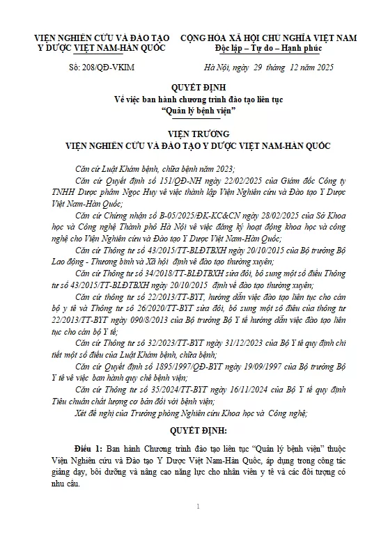 Ngày 29/12/2025, Viện trưởng Viện Nghiên cứu và Đào tạo Y Dược Việt Nam-Hàn Quốc đã ký ban hành Quyết định số 208/QĐ-VKIM về việc ban hành chương trình đào tạo liên tục "Quản lý bệnh viện"