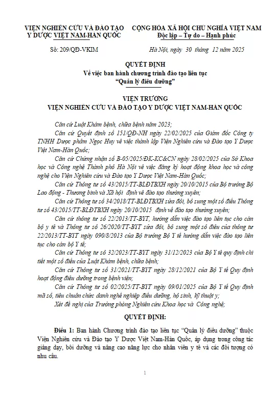 Ngày 30/12/2025, Viện trưởng Viện Nghiên cứu và Đào tạo Y Dược Việt Nam-Hàn Quốc đã ký và ban hành Quyết định số 209/QĐ-VKIM về việc ban hành chương trình đào tạo liên tục "Quản lý điều dưỡng".