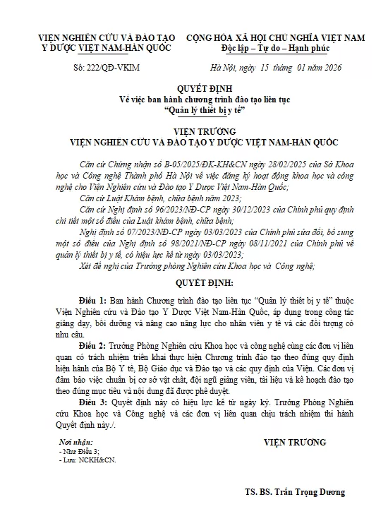 Ngày 15/01/2026, Viện trưởng Viện Nghiên cứu và Đào tạo Y Dược Việt Nam-Hàn Quốc đã ký và ban hành Quyết định số 222/QĐ-VKIM về việc ban hành chương trình đào tạo liên tục "Quản lý thiết bị y tế".