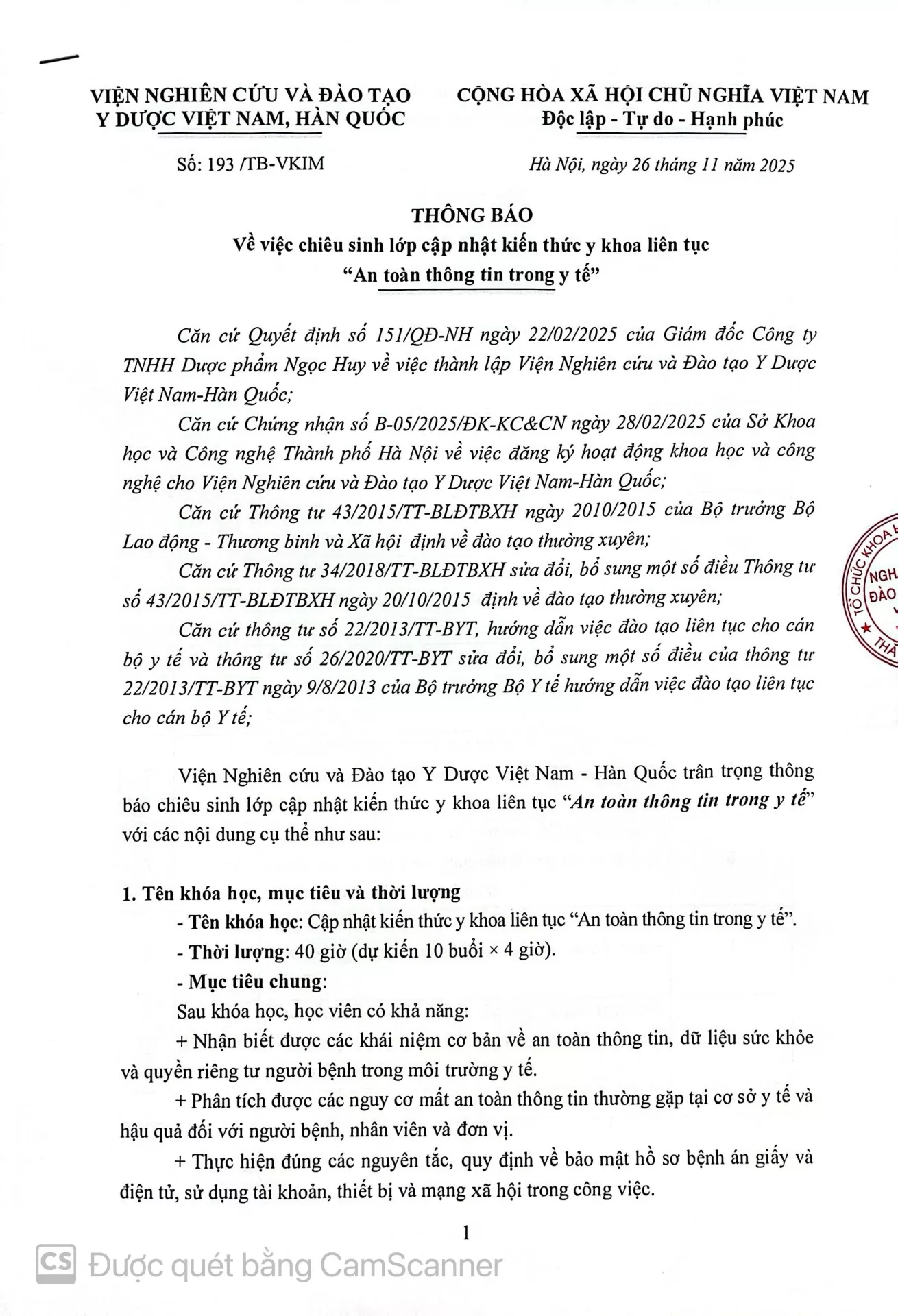 Căn cứ Chứng nhận số B-05/2025/ĐK-KC&CN ngày 28/02/2025 của Sở Khoa học và Công nghệ Thành phố Hà Nội về việc đăng ký hoạt động khoa học và công nghệ cho Viện Nghiên cứu và Đào tạo Y Dược Việt Nam-Hàn Quốc;