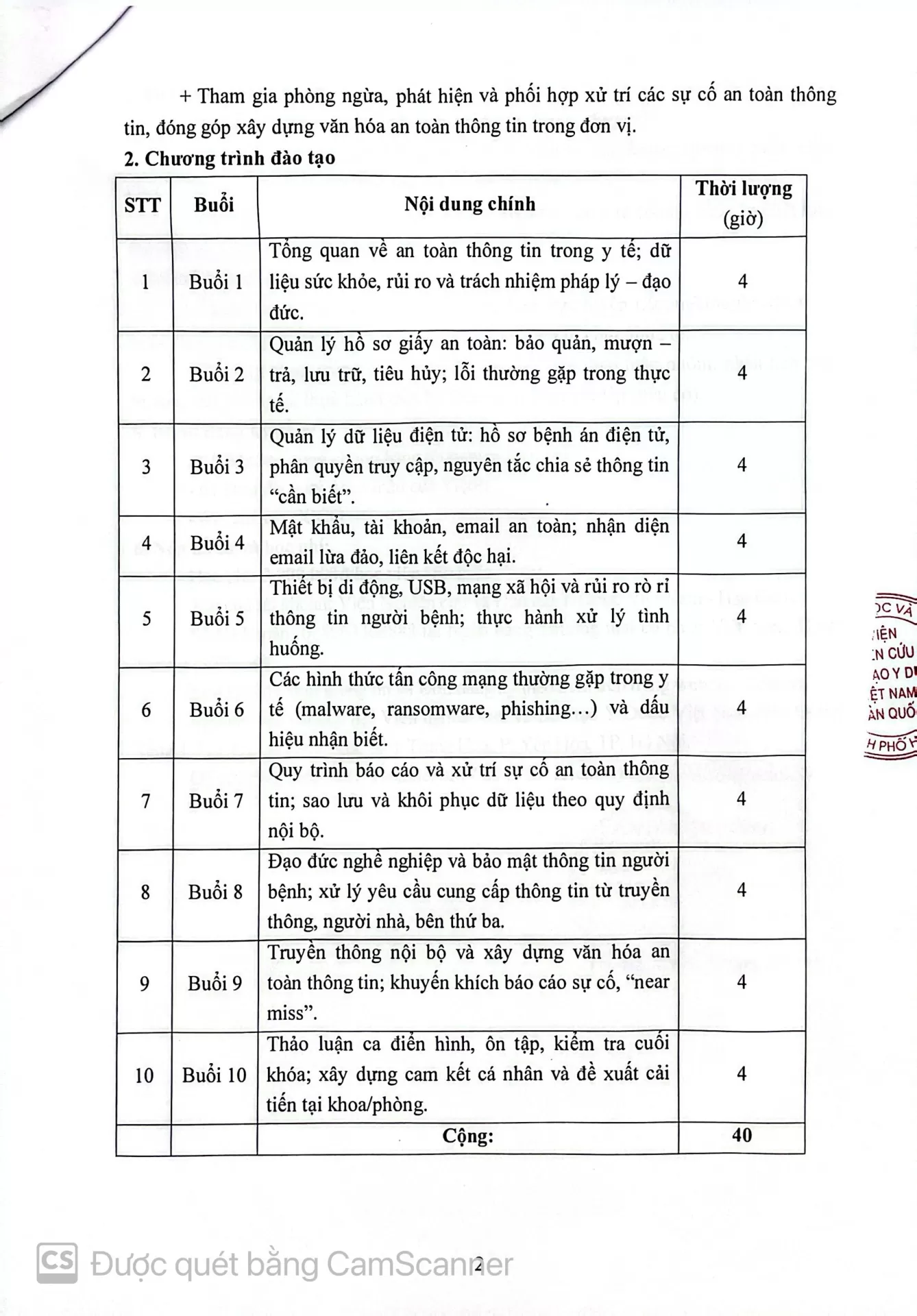 | 5 | Buổi 5 | Thiết bị di động, USB, mạng xã hội và rủi ro rò rỉ thông tin người bệnh; thực hành xử lý tình huống. | 4 |
