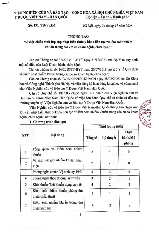 Căn cứ Quy chế số: 181/QC-VKIM ngày 18/11/2025 của Viện Nghiên cứu và Đào tạo Y Dược Việt Nam-Hàn Quốc về việc ban hành Quy chế tổ chức và đào tạo thường xuyên tại Viện Nghiên cứu và Đào tạo Y Dược Việt Nam-Hàn Quốc;