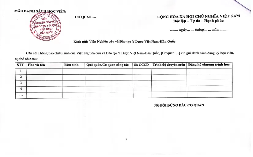 Căn cứ Thông báo chiêu sinh của Viện Nghiên cứu và Đào tạo Y Dược Việt Nam-Hàn Quốc, [Cơ quan….] xin gửi danh sách đăng ký học viên, cụ thể như sau:
