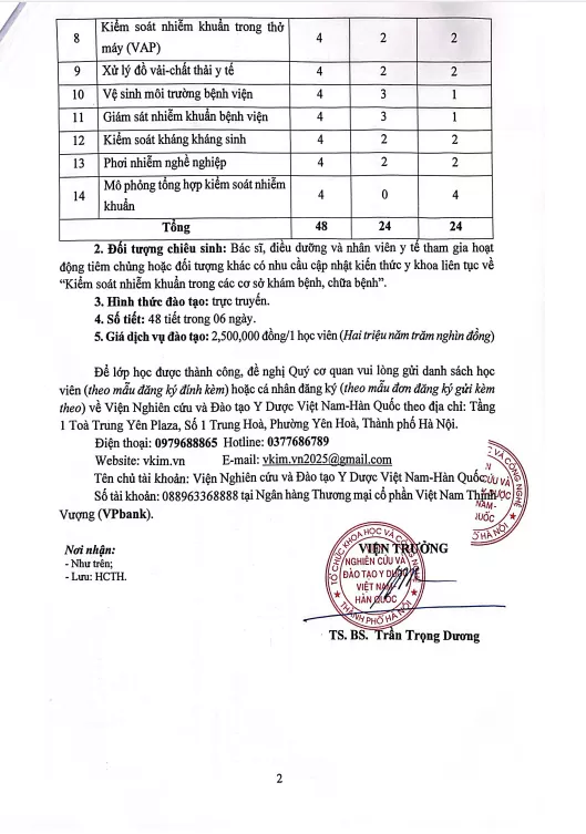2. Đối tượng chiêu sinh: Bác sĩ, điều dưỡng và nhân viên y tế tham gia hoạt động tiêm chủng hoặc đối tượng khác có nhu cầu cập nhật kiến thức y khoa liên tục về “Kiểm soát nhiễm khuẩn trong các cơ sở khám bệnh, chữa bệnh”.