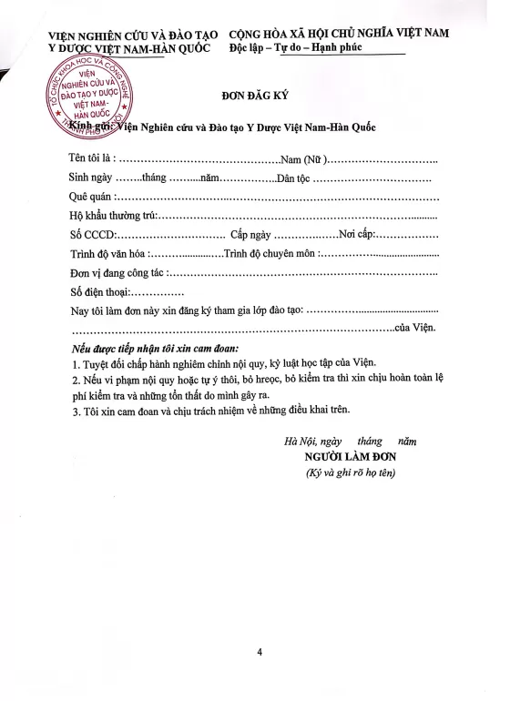 Để lớp học được thành công, đề nghị Quý cơ quan vui lòng gửi danh sách học viên (theo mẫu đăng ký đính kèm) hoặc cá nhân đăng ký (theo mẫu đơn đăng ký gửi kèm theo) về Viện Nghiên cứu và Đào tạo Y Dược Việt Nam-Hàn Quốc theo địa chỉ: Tầng 1 Toà Trung Yên Plaza, Số 1 Trung Hoà, Phường Yên Hoà, Thành phố Hà Nội.