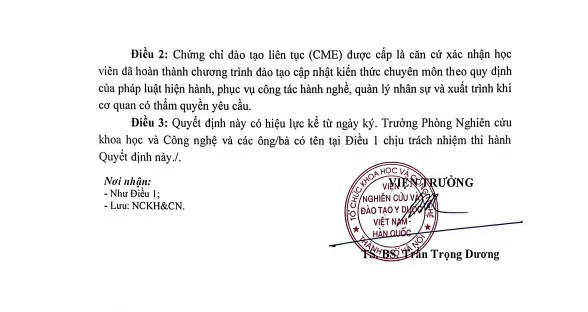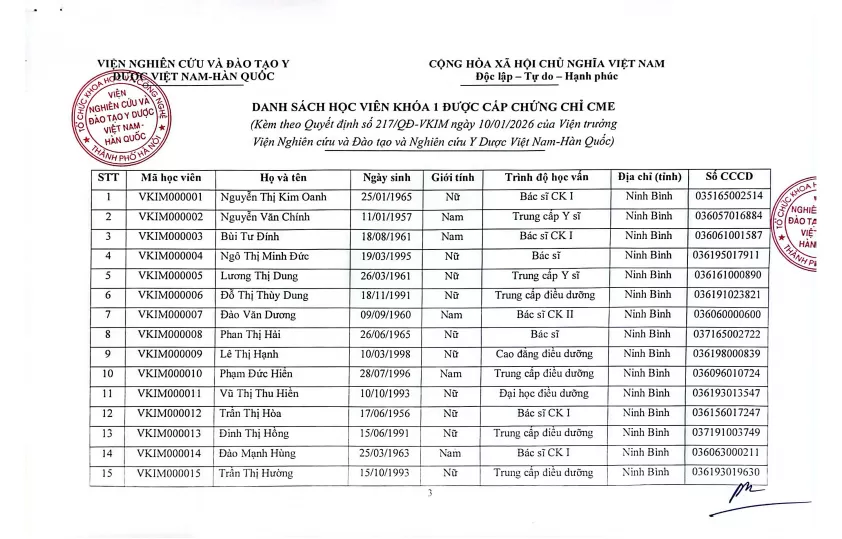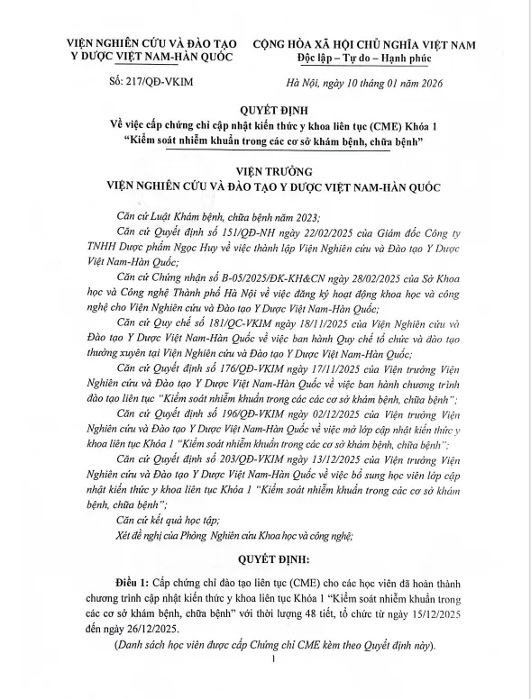 Căn cứ Kết quả học tập, ngày 10/01/2026 Viện trưởng Viện Nghiên cứu và Đào tạo Y Dược Việt Nam-Hàn Quốc đã ký và ban hành Quyết định số 217/QĐ-VKIM về việc cấp chứng chỉ cập nhật kiến thức y khoa liên tục (CME) "Kiểm soát nhiễm khuẩn trong các cơ sở khám bệnh, chữa bệnh" cho 35 học viên (Danh sách gửi kèm theo Quyết định).