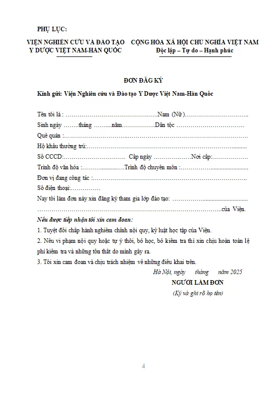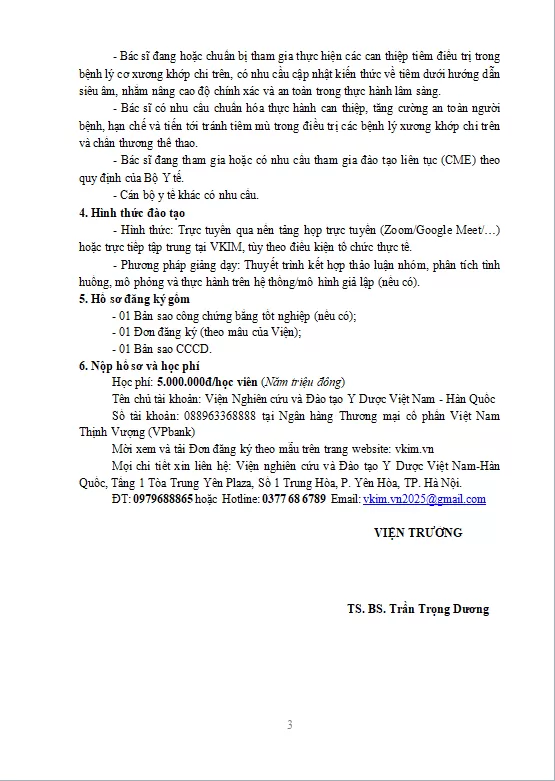 Mọi chi tiết xin liên hệ: Viện nghiên cứu và Đào tạo Y Dược Việt Nam-Hàn Quốc, Tầng 1 Tòa Trung Yên Plaza, Số 1 Trung Hòa, P. Yên Hòa, TP. Hà Nội.