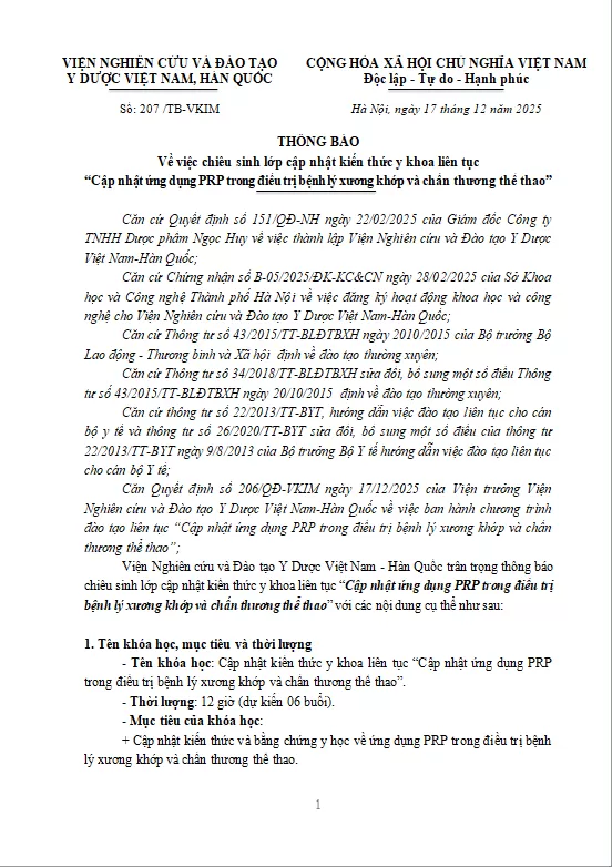 Thông báo số 207/TB-VKIM ngày 17/12/2025 của Viện Nghiên cứu và Đào tạo Y Dược Việt Nam-Hàn Quốc về việc chiêu sinhh lớp cập nhật kiến thức y khoa liên tục "Cập nhật ứng dụng PRP trong điều trị bệnh lý cơ xương khớp và chấn thương thể thao".