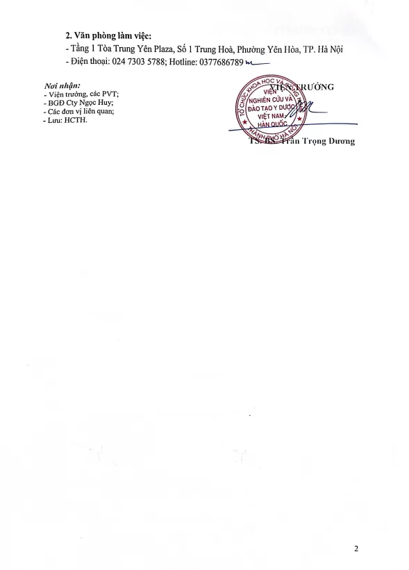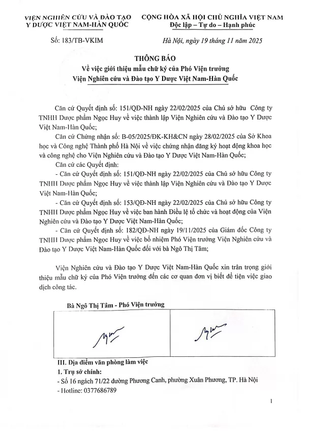 Ngày 19/11/2025, Viện Nghiên cứu và Đào tạo Y Dược Việt Nam - Hàn Quốc đã ban hành văn bản số 183/TB-VKIM về việc giới thiệu mẫu chữ ký của bà Ngô Thị Tâm-Phó Viện trưởng Viện Nghiên cứu và Đào tạo Y Dược Việt Nam - Hàn Quốc đến các cơ quan quản lý, cơ quan đơn vị đối tác biết để tiện việc giao dịch công tác.