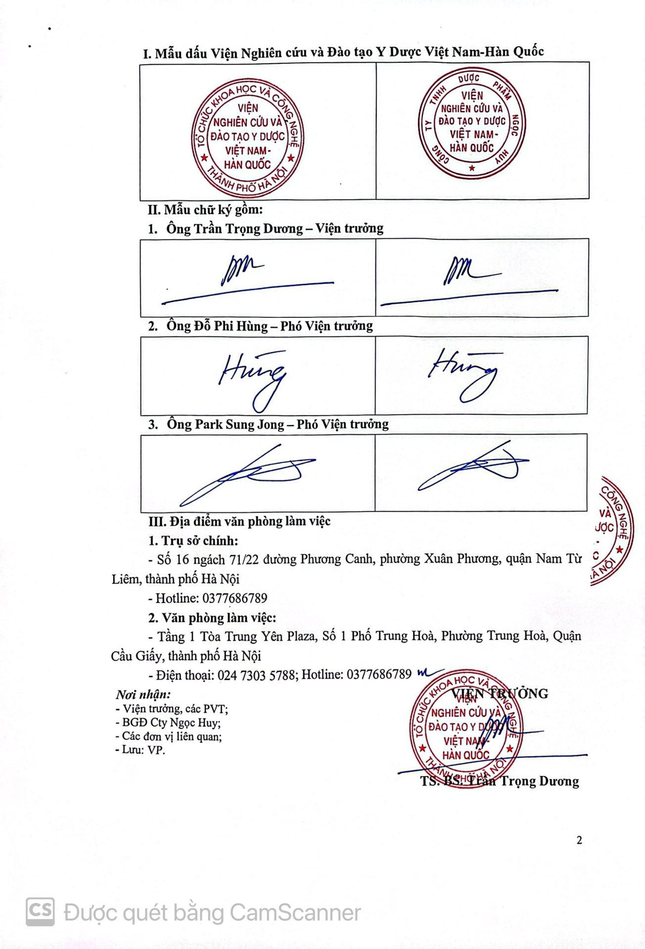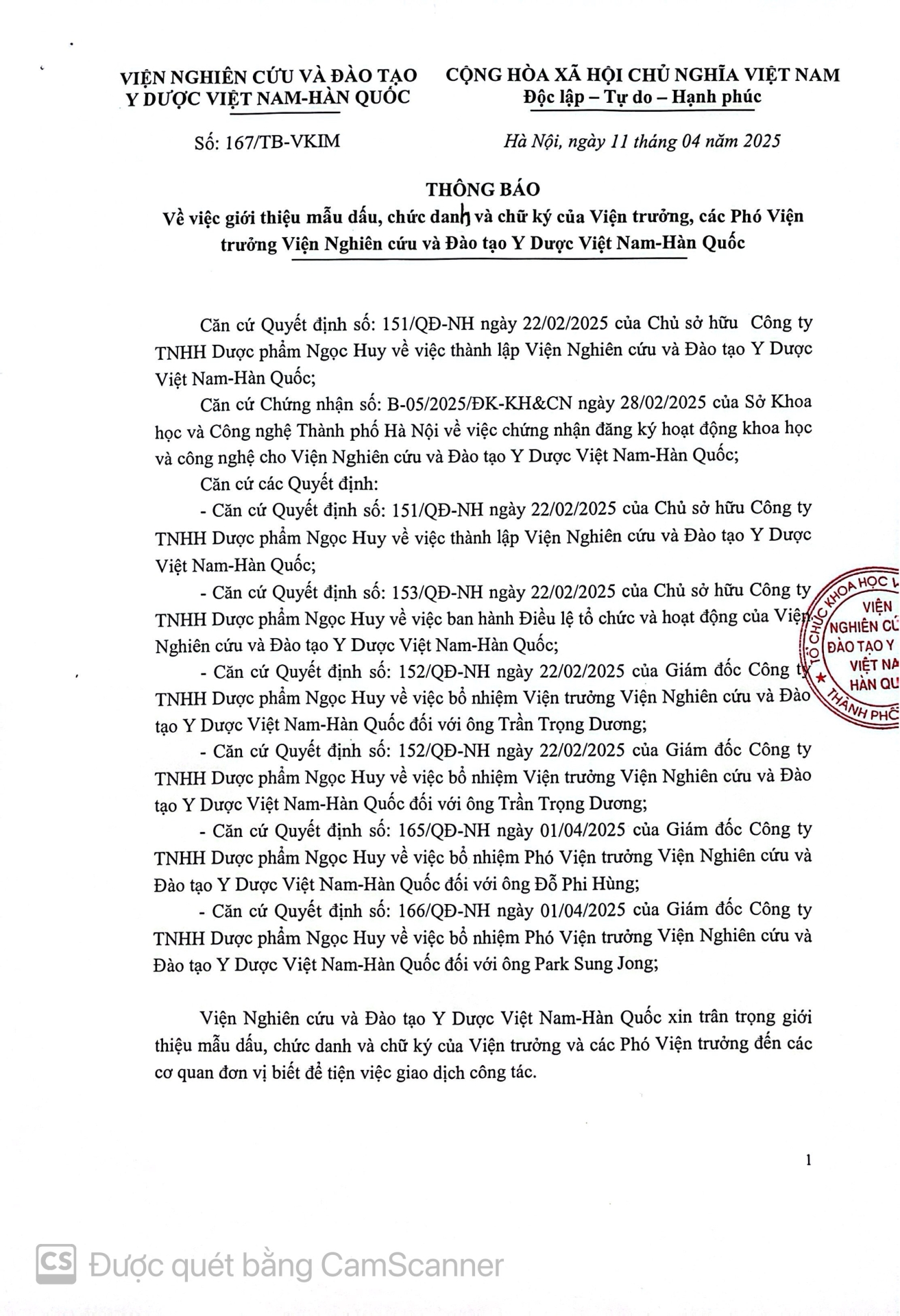 Ngày 11/04/2025, Viện Nghiên cứu và Đào tạo Y Dược Việt Nam - Hàn quốc thông báo về việc giới thiệu mẫu dấu, chức danh và chữ ký của Viện trưởng, các Phó Viện trưởng