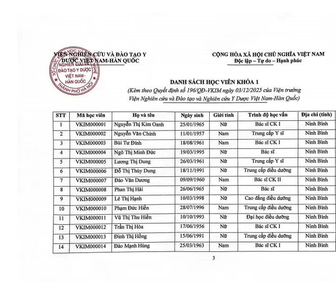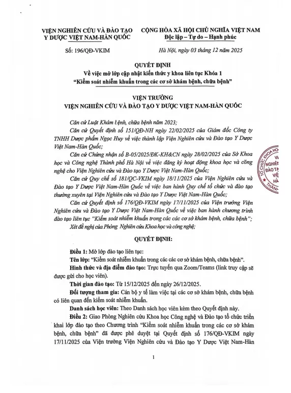 Viện Nghiên cứu và Đào tạo Y Dược Việt Nam – Hàn Quốc (VKIM) thông báo mở Lớp đào tạo liên tục Khóa 1 theo Quyết định số 196/QĐ-VKIM ngày 03/12/2025 của Viện trưởng.