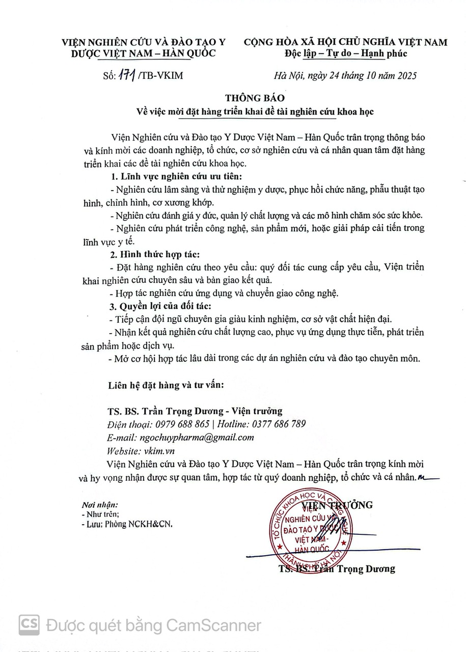 Viện Nghiên cứu và Đào tạo Y Dược Việt Nam – Hàn Quốc trân trọng thông báo và kính mời các doanh nghiệp, tổ chức, cơ sở nghiên cứu và cá nhân quan tâm đặt hàng triển khai các đề tài nghiên cứu khoa học.