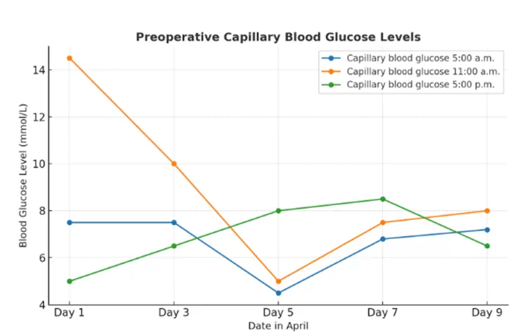 Capillary blood glucose measured at 11:00 a.m. showed a significant decrease from an initially high level, reaching its lowest point on day 5 before slightly increasing thereafter. In comparison, glucose levels measured at 5:00 a.m. remained stable until day 3, dropped markedly on day 5, and then gradually rose. Conversely, blood glucose levels recorded at 5:00 p.m. demonstrated a continuous upward trend, peaking on day 7 before declining on day 9. Overall, after day 5, glucose levels at all three time points exhibited a trend toward stabilization.